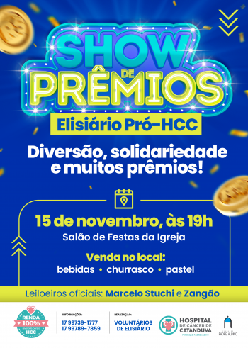 No dia 15 de novembro, Elisiário se une mais uma vez em solidariedade ao Hospital de Câncer de Catanduva (HCC) com a realização de Show de Prêmios. O evento acontece a partir das 19 horas, no Salão de Festas da Paróquia Imaculada Conceição, e promete uma noite animada, com diversão, solidariedade e prêmios para todos os gostos.