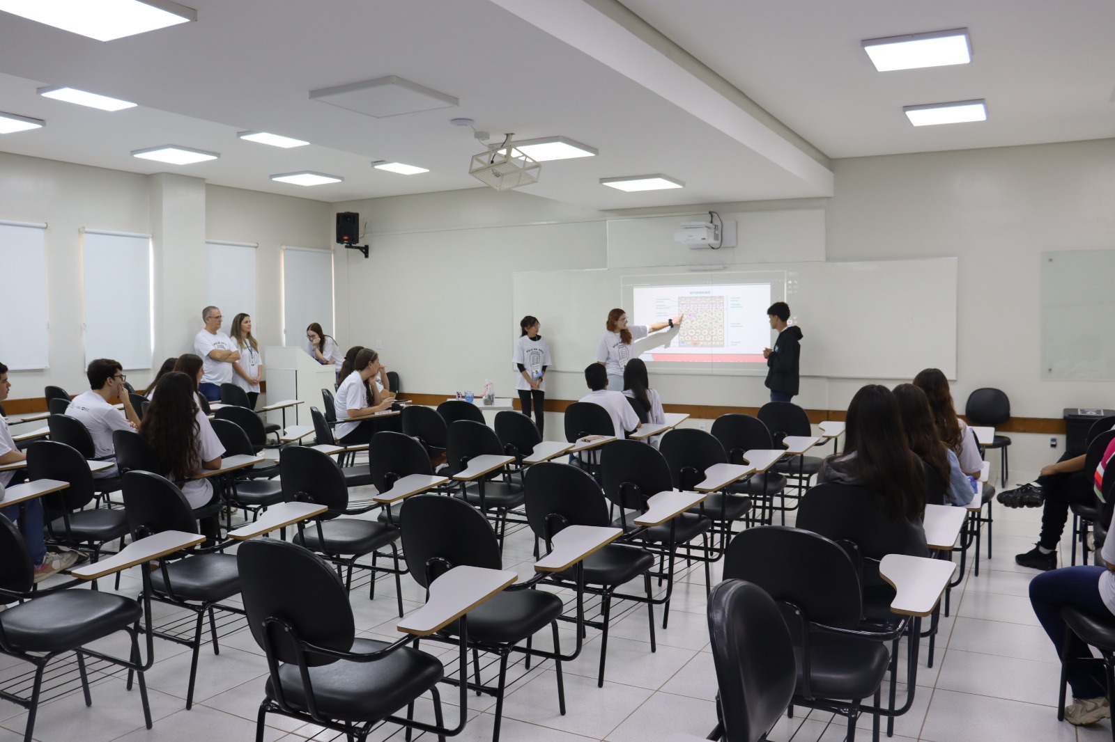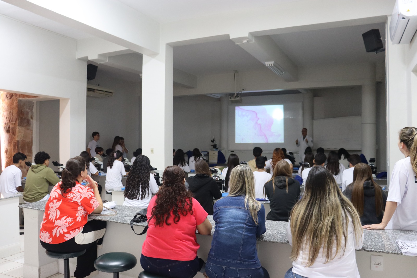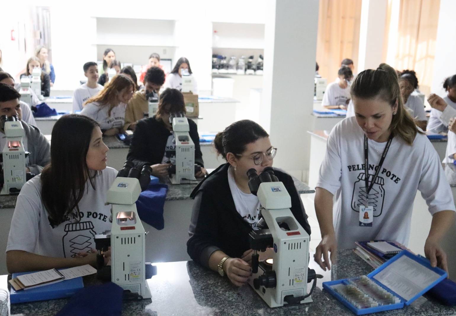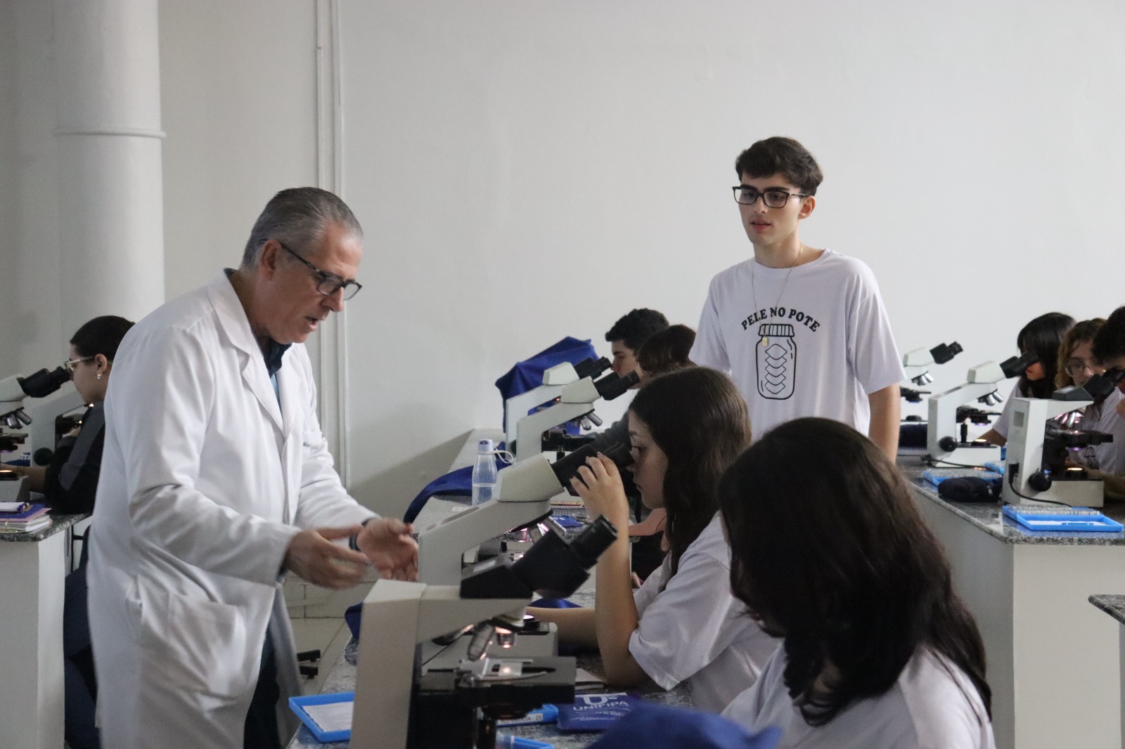 Ao longo do programa, os estudantes participaram de aulas práticas de microscopia, visitas aos laboratórios e atividades de compreensão das estruturas da epiderme e da derme. As turmas também foram acompanhadas por seis acadêmicos do curso de Medicina, que atuaram como assistentes estudantis: Lívia Braga Held, Ana Júlia Chiodini França, Letícia Napolitano Maziero, Ana Clara de Laurentiz Banzato, Laura Leal Perondi e Leonardo Corrêa Ferreira Manduca.