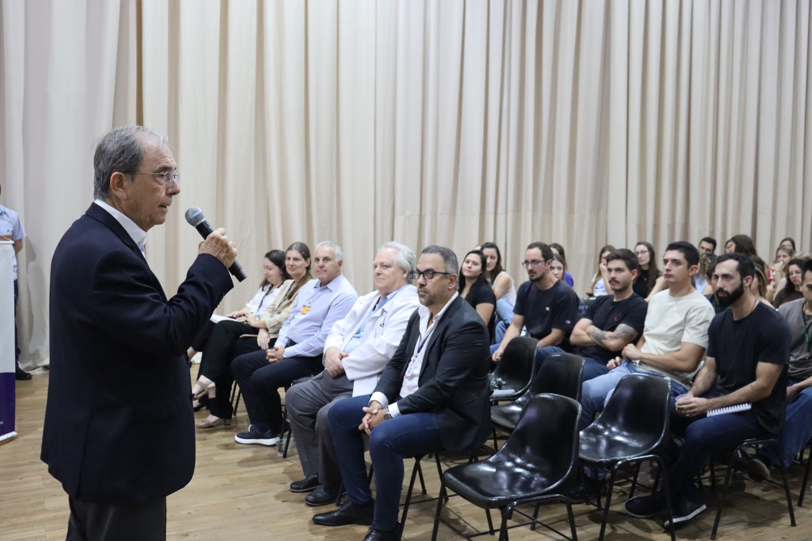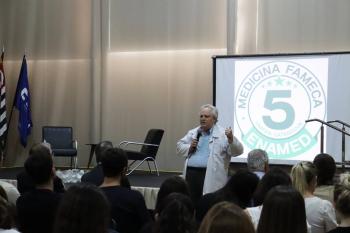 O coordenador do curso de Medicina, Prof. Dr. Jorge Luís Valiatti, fez breve saudação aos alunos, reforçando a relevância do Internato para a trajetória profissional e para a prática médica e a Dra. Leila Renata Ramires Masteguin, do Departamento Jurídico da UNIFIPA, abordou aspectos relacionados às responsabilidades legais e éticas inerentes ao exercício da Medicina.