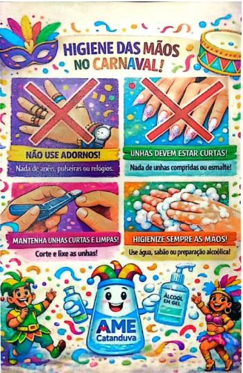 O AME Catanduva realizou, na sexta-feira e segunda-feira de Carnaval, a ação educativa “Higiene das Mãos no Carnaval”, com o objetivo de conscientizar colaboradores, pacientes e acompanhantes sobre a importância da prática na prevenção de infecções relacionadas à assistência à saúde. Ao todo, 79 pessoas foram abordadas pela equipe do Serviço de Controle de Infecção Hospitalar (CCHI) em parceria com a gerência de enfermagem da unidade, utilizando abordagem temática alusiva ao período carnavalesco para tornar a mensagem mais acessível e atrativa. Durante a ação foram distribuídos folders informativos com orientações sobre a correta higienização das mãos, reforçando a necessidade desse cuidado tanto no ambiente de saúde quanto no dia a dia.