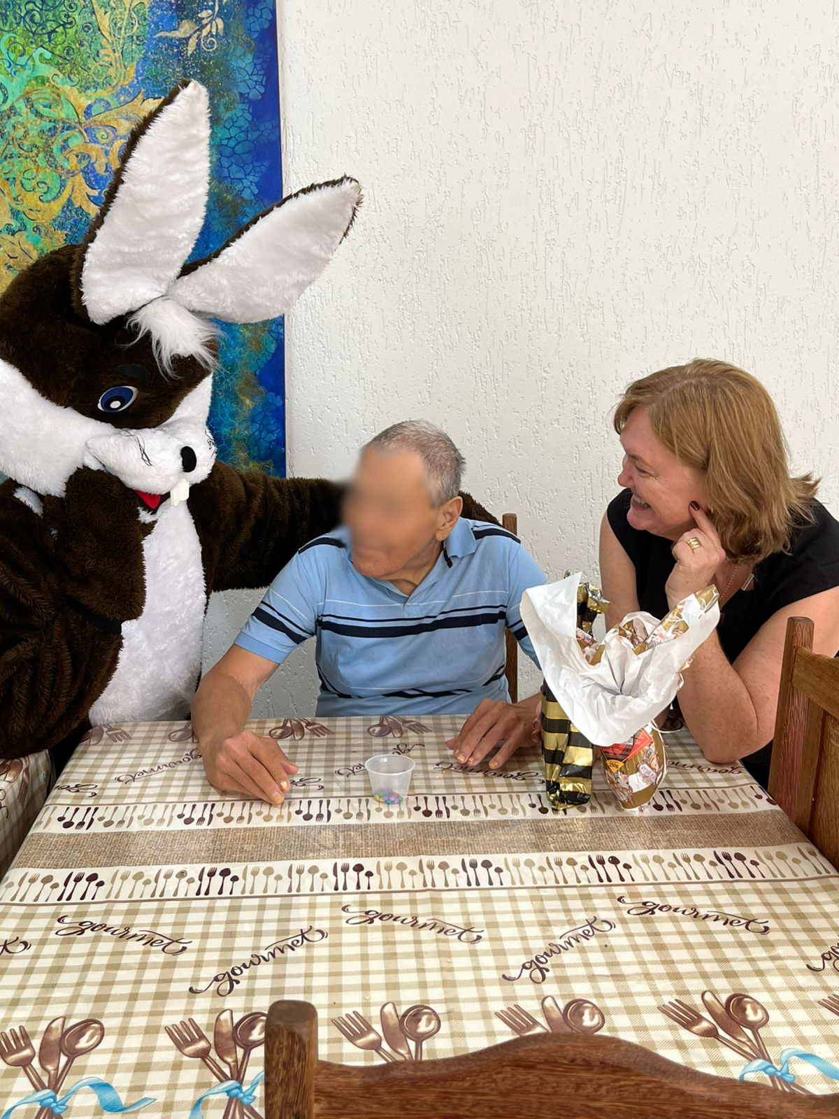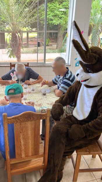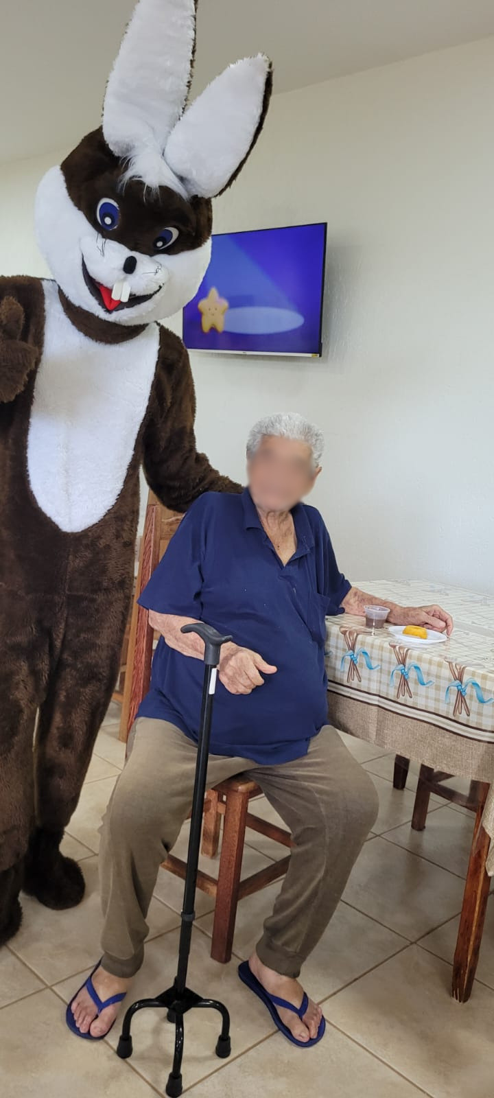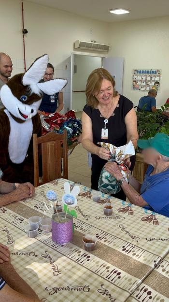A programação contou ainda com a presença especial do Coelhinho da Páscoa que, de forma lúdica, interagiu com as pessoas idosas proporcionando mais leveza ao momento. Outro destaque foi a entrega de ovos de chocolate. O Coelhinho percorreu os espaços da instituição distribuindo os doces e levando alegria aos residentes, reforçando o espírito da Páscoa — data que simboliza renovação, esperança e amor ao próximo. Para contribuir com esse momento de celebração estiveram presentes representantes do Fundo Social de Solidariedade de Catanduva, que doaram ovos de chocolate para os residentes.
