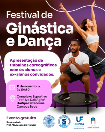 O curso de Educação Física da Unifipa promove, na próxima terça-feira, 11 de novembro, a nova edição do Festival de Ginástica e Dança, um dos eventos mais aguardados do calendário acadêmico. O espetáculo terá início às 19h30, na quadra do complexo esportivo “Prof. Ivo Dall’Aglio”, no campus sede da instituição.