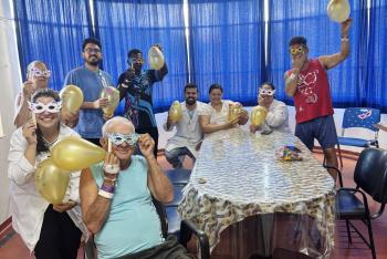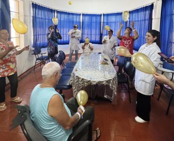 Já no HEC, a ação “Bloquinho da Alegria” foi realizada na segunda-feira de carnaval, envolvendo atividades criativas e interativas. Os participantes confeccionaram máscaras carnavalescas, trabalhando coordenação motora, reconhecimento de cores e expressão criativa. A programação seguiu com momentos de canto, dança e uma dinâmica com bexigas, que estimulou mobilidade, concentração e interação social, proporcionando ambiente acolhedor e descontraído.