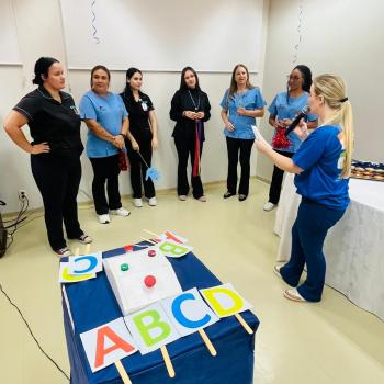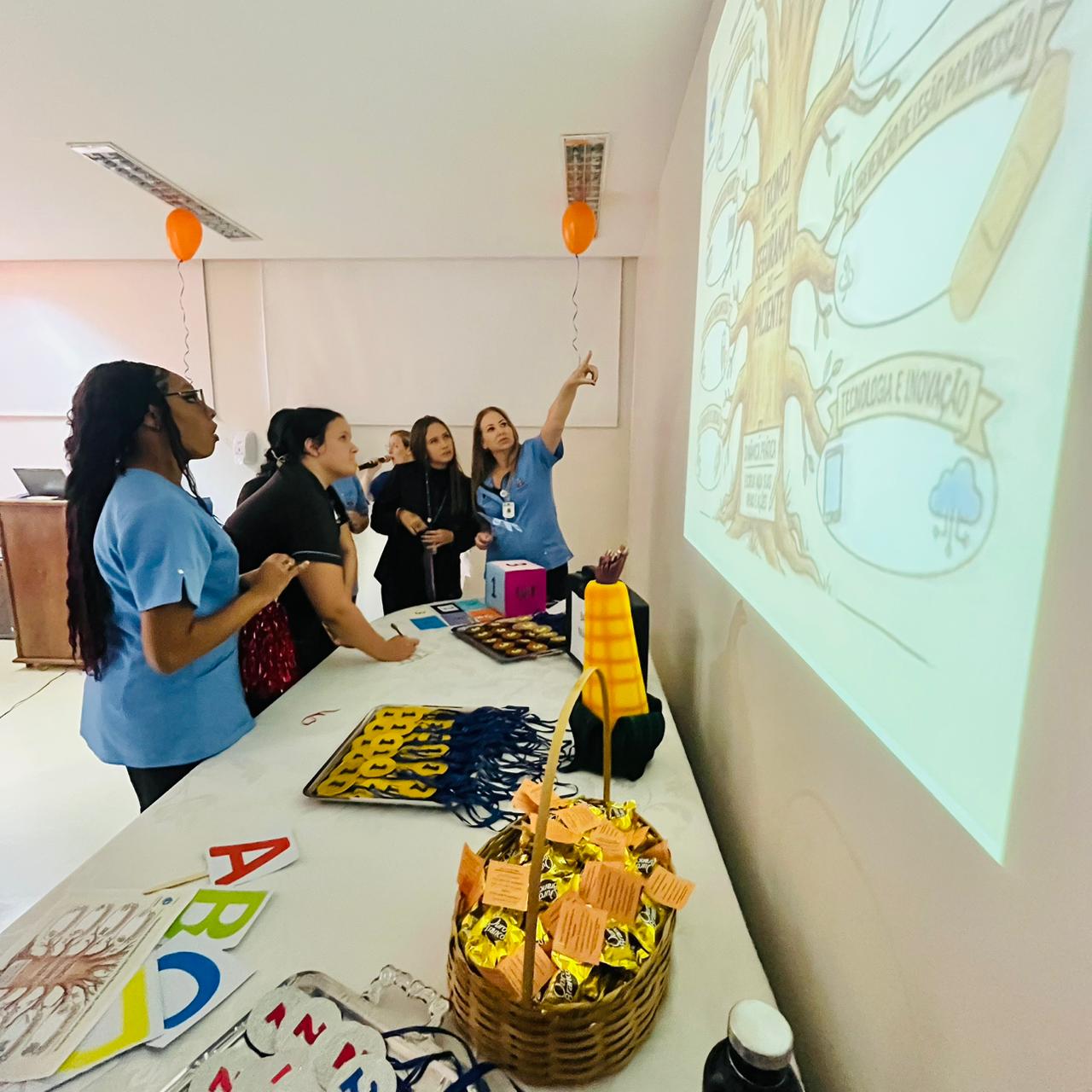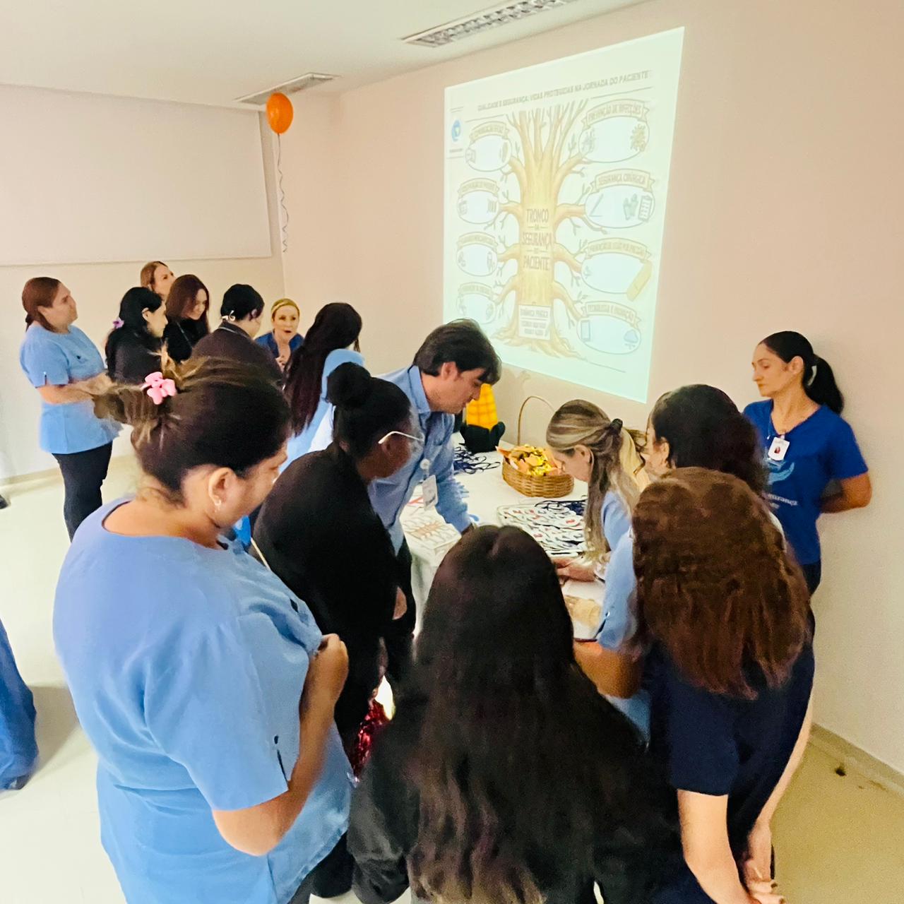 A programação teve início com dinâmica sobre à “Árvore da Segurança do Paciente”, na qual os participantes refletiram sobre a importância do compromisso com a qualidade e o cuidado, representado pelo tronco da árvore, enquanto os galhos simbolizavam as metas de segurança do paciente. Durante a atividade, as equipes registraram atitudes simples do cotidiano que contribuem para prevenir riscos e acidentes. Cada grupo também foi incentivado a colaborar com pelo menos uma ação segura em cada tema proposto, com o objetivo de construir, de forma coletiva, uma árvore que representasse a prática assistencial da instituição.
