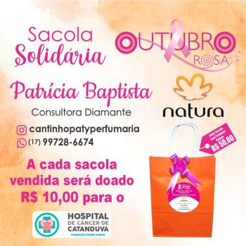 Em apoio à luta contra o câncer de mama, a consultora 'Diamante Natura', Patrícia Baptista, lançou a Campanha Sacola Solidária, alusiva ao Outubro Rosa.