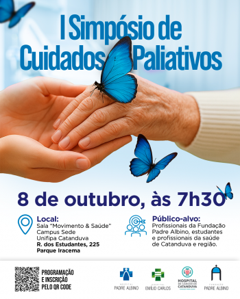 No dia 8 de outubro (quarta-feira), será realizado o I Simpósio de Cuidados Paliativos promovido pela Fundação Padre Albino em parceria com o Hospital Emílio Carlos. O evento ocorrerá na Sala Movimento & Saúde, no campus sede da UNIFIPA, reunindo profissionais de saúde, estudantes e interessados para discutir práticas interdisciplinares voltadas ao cuidado de pacientes com doenças crônicas avançadas ou em fase terminal.