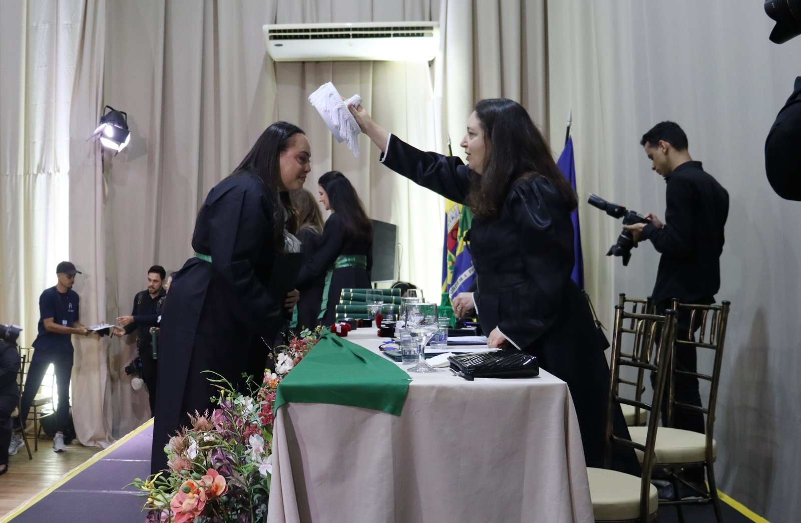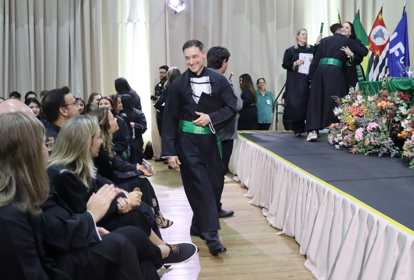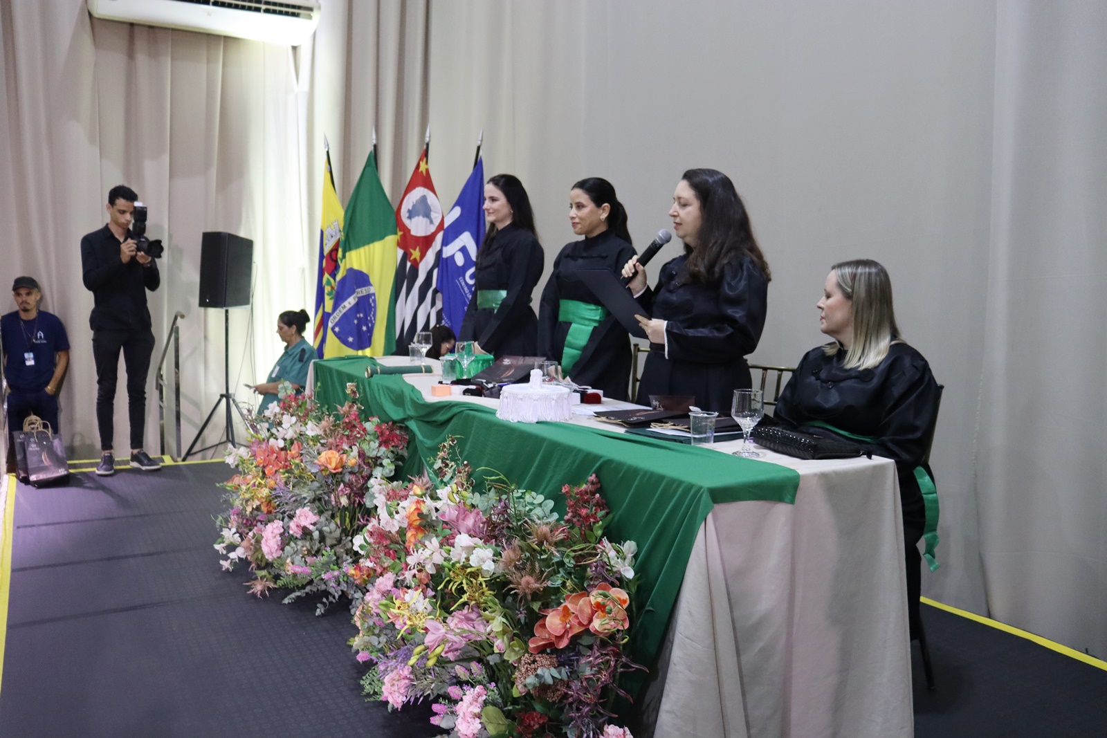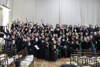 A turma recebeu o nome da Profa. Dra. Taís Pagliuco Barbosa, docente homenageada pelos formandos, que compôs a mesa oficial ao lado da pró-reitora de Ensino de Graduação, Extensão, Assuntos Comunitários e EaD, Profa. Dra. Andréia de Haro Moreno, que conduziu a outorga, da coordenadora do curso, Profa. Dra. Luciana Braz de Oliveira Paes, e da paraninfa, Profa. Dra. Letícia Aparecida Schiave.