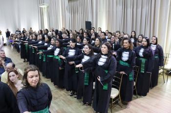 A simbólica passagem da lâmpada - Um dos momentos esperados foi a tradicional Passagem da Lâmpada, gesto que homenageia a pioneira da Enfermagem moderna, Florence Nightingale, que usava uma lamparina para cuidar de soldados feridos na Guerra da Crimeia, tornando-se símbolo de luz e conforto. A luz percorreu o auditório como lembrete da responsabilidade que acompanha o exercício da profissão. A formanda Yasmin Vitória Viani Borges repassou a lâmpada à colega do 3º ano Lívia Bucalon Brachi.