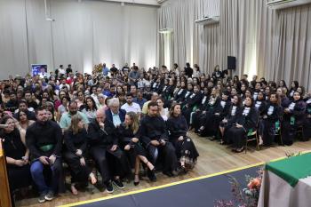 Representando os formandos, Yasmin lembrou os desafios enfrentados na trajetória acadêmica e a força coletiva que os sustentou até a conquista do diploma. “Cada noite de estudo, estágios e ensinamentos recebidos nos moldou para este momento. A Enfermagem exige técnica, mas também empatia. Levaremos conosco tudo o que aprendemos aqui — especialmente o compromisso com o cuidado que transforma realidades”. Após as falas oficiais, os formandos entregaram mimos aos docentes e colaboradores homenageados pela turma, como gratidão àqueles que contribuíram para sua formação.