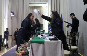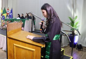 O juramento profissional foi conduzido pela formanda Ana Julia Arem, reafirmando os princípios éticos e o compromisso com o cuidado humanizado.