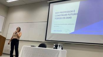 A palestra principal, “Ser Professor é construir futuro todos os dias: uma jornada de transformação, acolhimento e aprendizado”, foi ministrada pela Profa. Esp. Lizzy Gomes Bueno Azevedo, docente da EE Paulo de Lima Corrêa – SEDUC/SP, que abordou a identidade docente, os desafios da formação inicial e o papel do professor na sociedade contemporânea.