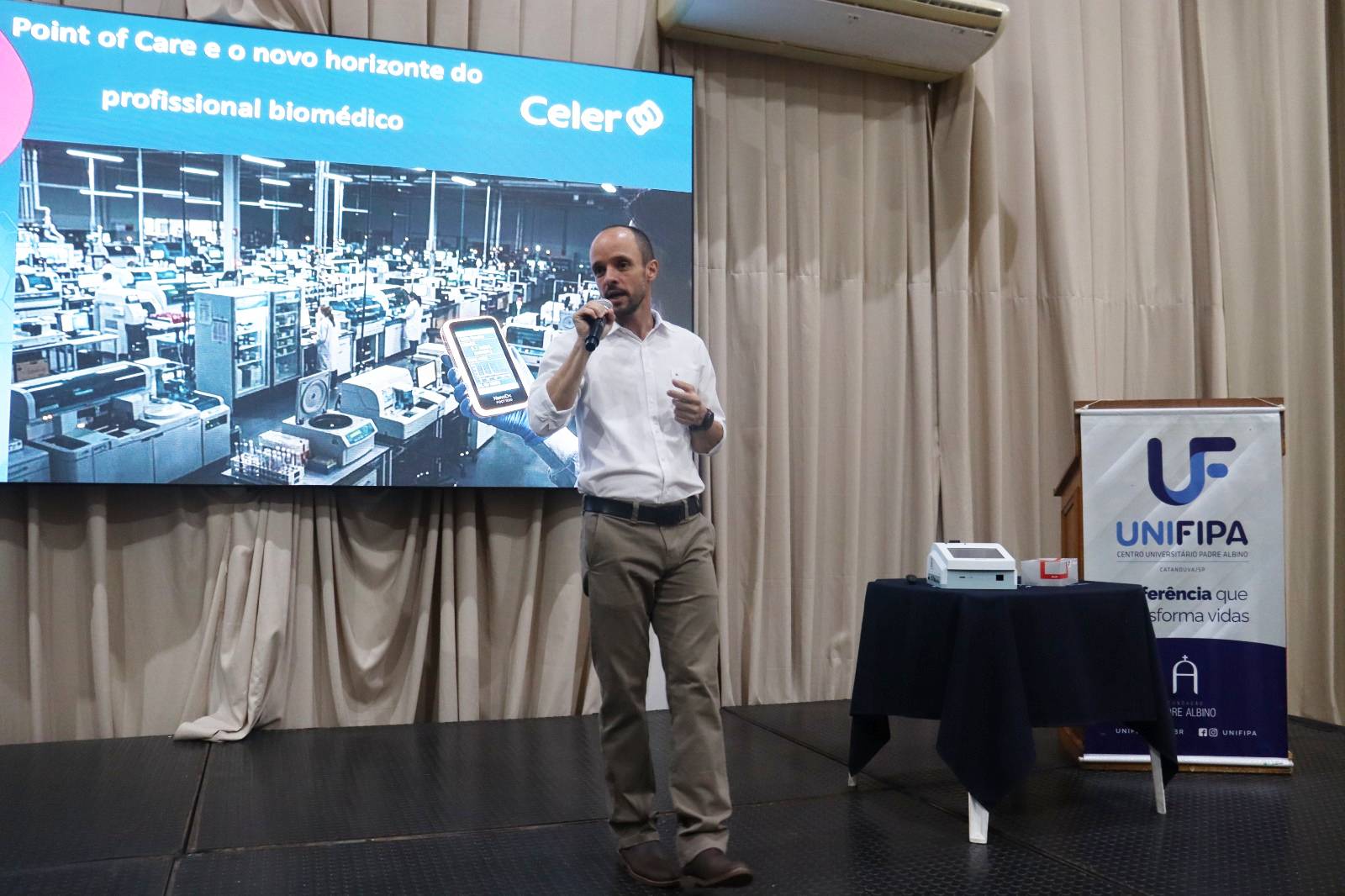Já no dia 16 de abril foi realizado o II Biomed Day Pocket, promovido em parceria com a empresa Welldone – Assistência Laboratorial. A programação teve início com a palestra “A revolução diagnóstica: Point of Care e o papel do profissional biomédico neste novo cenário”, ministrada pelo Dr. João Paulo de Moura Guimarães, biomédico, gestor em biotecnologia e consultor técnico de vendas, que abordou as transformações nos métodos diagnósticos e o protagonismo do biomédico frente às novas tecnologias. Na sequência, o Prof. Dr. Daniel Henrique Gonçalves, biomédico e coordenador do curso de Biomedicina da UNIFIPA, ministrou a palestra “Biomédico de elite”, trazendo reflexões sobre a formação e o desempenho profissional na área. Ao final das palestras, os docentes Profa. Dra. Nathália Maciel Maniezzo Stuchi e Prof. Dr. Manzélio Cavazzana Junior promoveram bate-papo com os entrevistados e abriram espaço para perguntas dos participantes.
