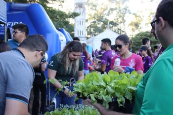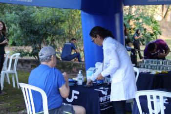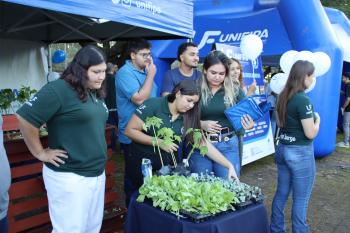 Alunos e professores do curso de Enfermagem realizaram aferição de pressão arterial e testes de glicemia, oferecendo orientações e cuidados preventivos ao público presente. Já o curso de Agronomia participou com a distribuição de mudas, orientações sobre cultivo e cuidados com as plantas, incentivando práticas sustentáveis e o contato com a natureza.