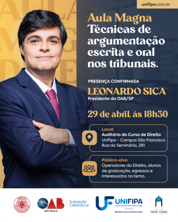 A Unifipa Catanduva, em parceria com a OAB – Subseção de Catanduva, promove na próxima quarta-feira, 29 de abril, a Aula Magna do curso de Direito com o tema “Técnicas de argumentação escrita e oral nos tribunais”. O evento será às 18h30, no auditório do curso no Campus São Francisco, na Rua do Seminário, 281, e é voltado a operadores do Direito, estudantes de graduação, egressos e demais interessados.